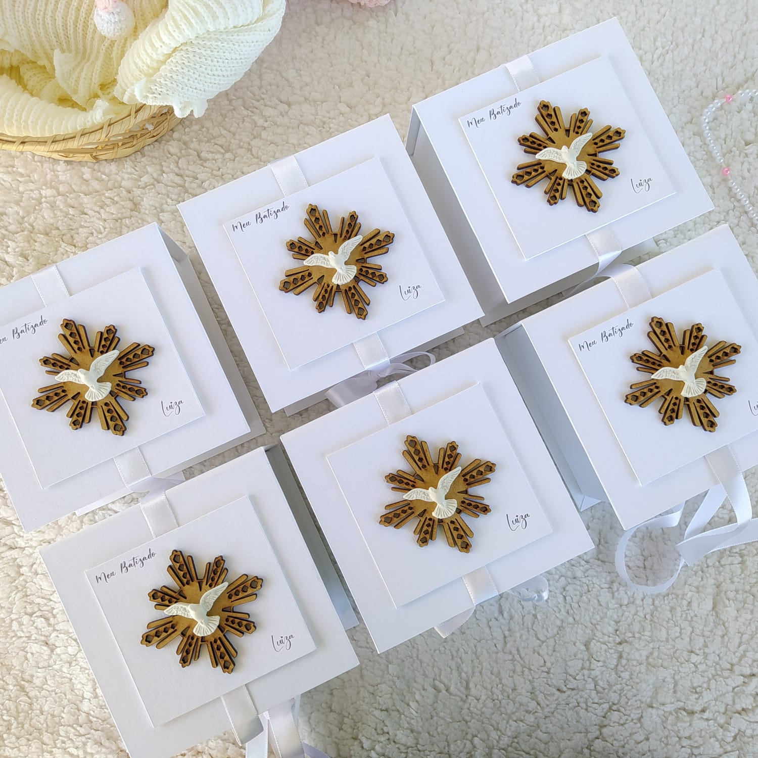 Caixa Livro convite para Padrinhos de Batismo feita em Cartonagem com fechamento em fita de cetim. Na tampa temos uma placa onde colamos o Divino Espeiro Santo em mdf e a pombinha branca feita em resina