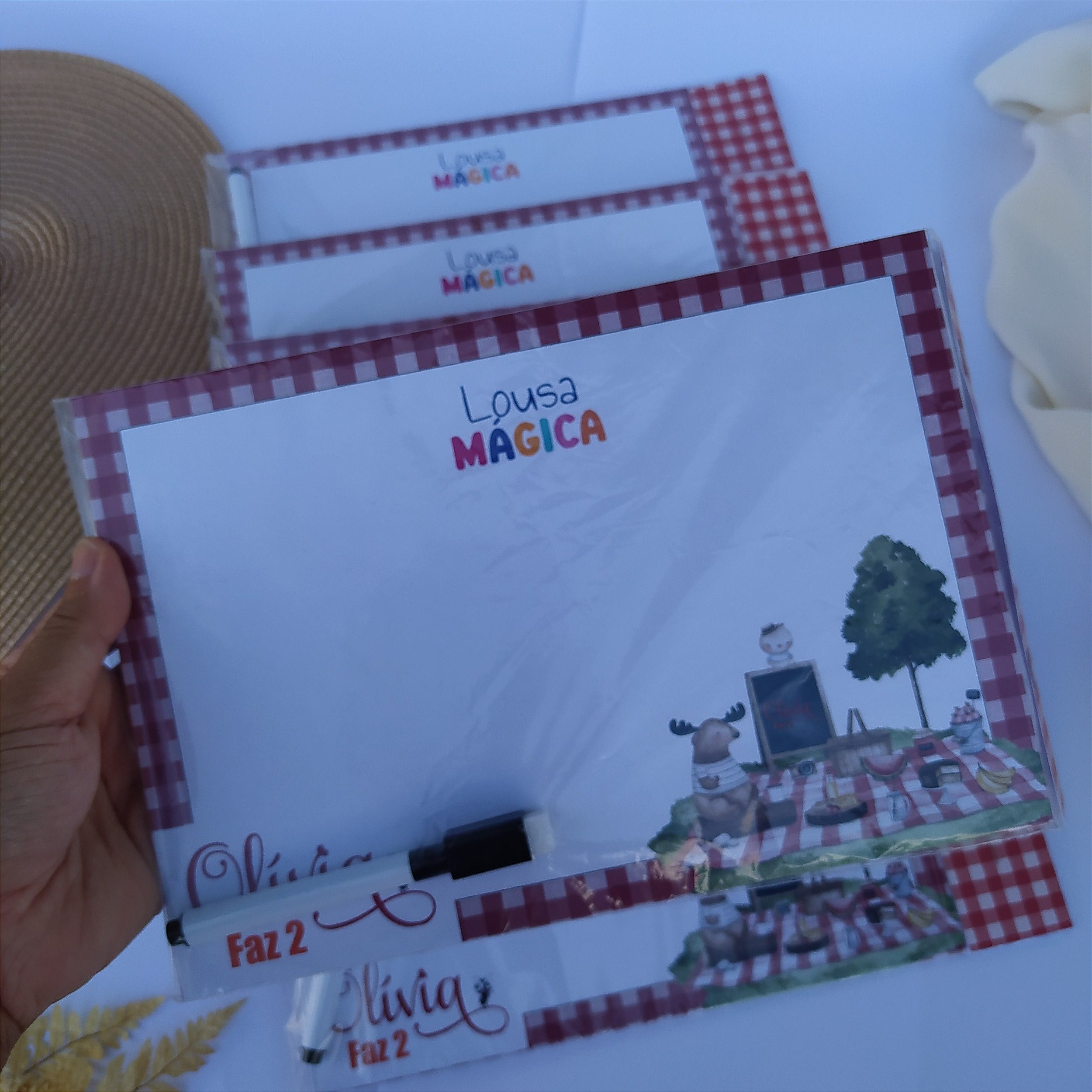 As lousas são embaladas individualmente com saquinhos transparente e tag personalisada para o fechamento.